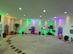 Oratórios com as devoções da Associação Evangelizar é Preciso – Jesus das Santas Chagas, Nossa Senhora do Carmo, São José e São Pio de Pietrelcina – foram pontos de silêncio e prece. Os fiéis puderam percorrer cada um deles na sala ambientada para remeter à natureza da Terra Prometida da Obra Evangelizar é Preciso, incluindo a doação de mudas no sábado (28). Também havia um totem com informações desse sonho, que está na fase final de aquisição e ainda depende do apoio do povo de Deus. Ao ver, a emoção tomou conta, principalmente, de quem apoiou o Livro Ouro pela compra do terreno, como Graziella Rosa de Lima. Ela trouxe a contribuição presencialmente ao vir na caravana de Divinópolis (MG) ao Retiro Nacional. “É gratificante poder ajudar, de todo o coração. Espero realizar outra doação em breve”, afirmou a associada e Mensageira de Jesus das Santas Chagas.